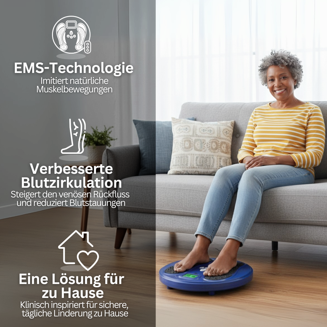 LegRelief Pro™ ist eine klinisch inspirierte Heimanwendung mit EMS (Elektrische Muskelstimulation), die sanft die Muskeln in Füßen und Waden aktiviert. Diese Stimulation fördert die Blutzirkulation, hilft Schwellungen zu reduzieren, Beschwerden zu lindern und Komfort zurückzugeben.